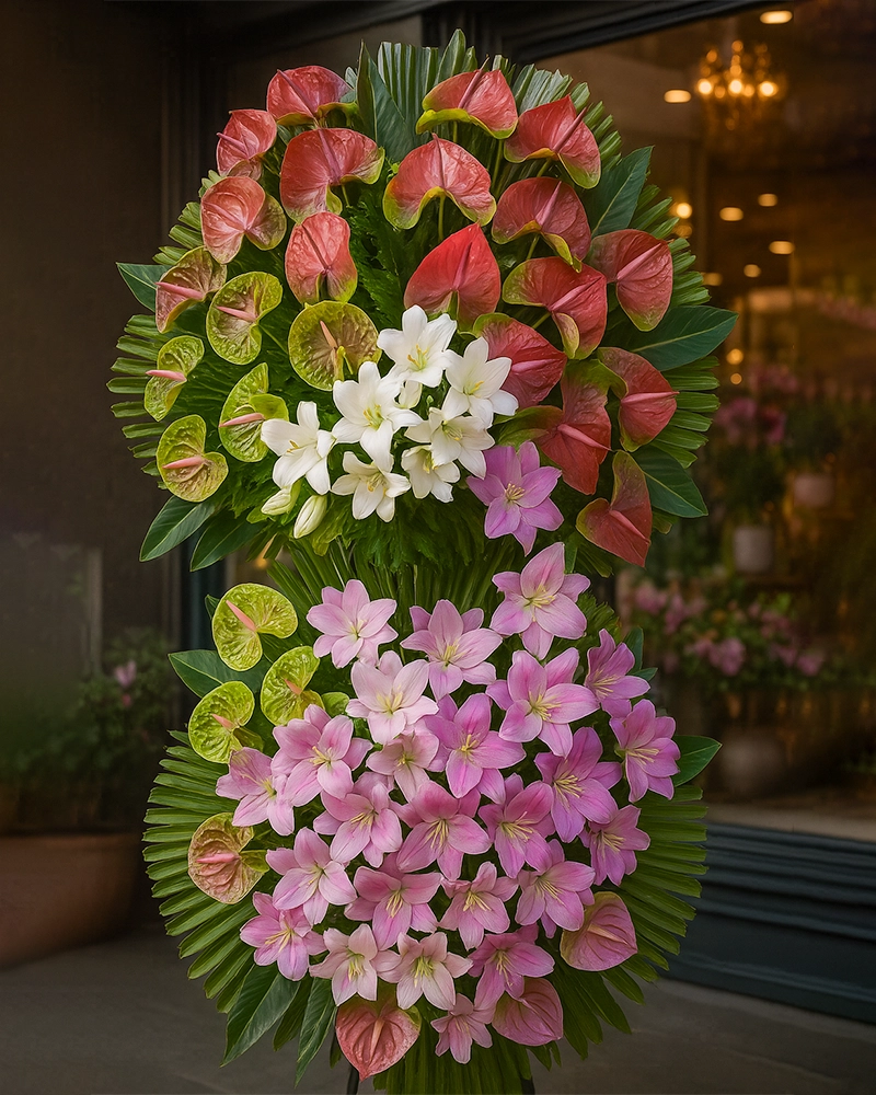 تاج گل فلزی دو طبقه با ترکیب چشمنواز گلهای آنتریوم قرمز و سبز زیتونی در کنار لیلیومهای سفید و صورتی، جلوهای از زیبایی و اصالت را به نمایش میگذارد. این تاج گل با طراحی متقارن و رنگبندی فاخر، گزینهای مناسب برای مراسمهای رسمی، افتتاحیهها و حتی تسلیتهای محترمانه است. استفاده از برگهای پالم در پسزمینه، ساختار گلآرایی را منظم و باشکوه جلوه میدهد.