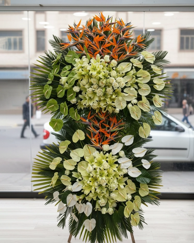 تاج گل فلزی دوطبقه با ترکیب آنتریوم کرم، لیلیوم سفید و استرلیتزیا نارنجی، طراحیای خاص و تشریفاتی برای افتتاحیه و مراسم تبریک.