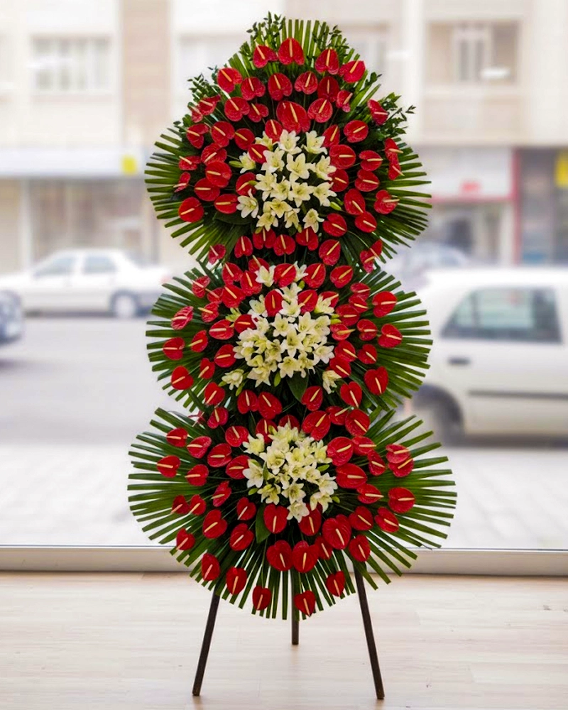 تاج گل فلزی سهطبقه با گل آرایی لوکس از آنتریوم قرمز و لیلیوم سفید؛ مناسب افتتاحیه و تبریکهای رسمی و باشکوه.