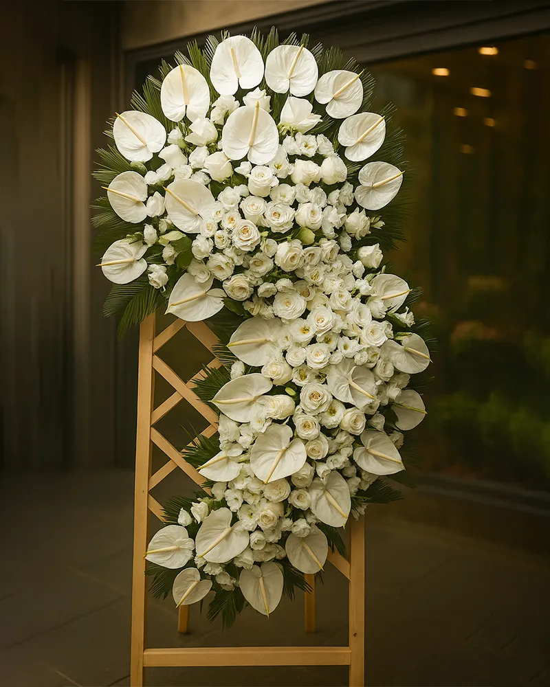 تاج گل پایه شبکهای با طراحی آبشاری و گلآرایی تمامسفید از آنتریوم و رز، مناسبترین انتخاب برای ابراز احترام و تسلیت در مراسم رسمی.